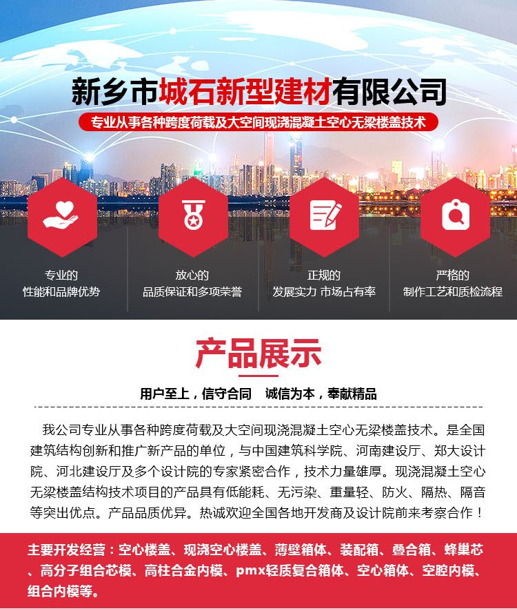 我公司主要從事各種跨度荷載及大空間現(xiàn)澆混凝土空心無梁樓蓋技術(shù)。是全國建筑結(jié)構(gòu)創(chuàng)新和推廣新產(chǎn)品的單位,與中國建筑科學(xué)院、河南建設(shè)廳等多個(gè)設(shè)計(jì)院緊密合作。...